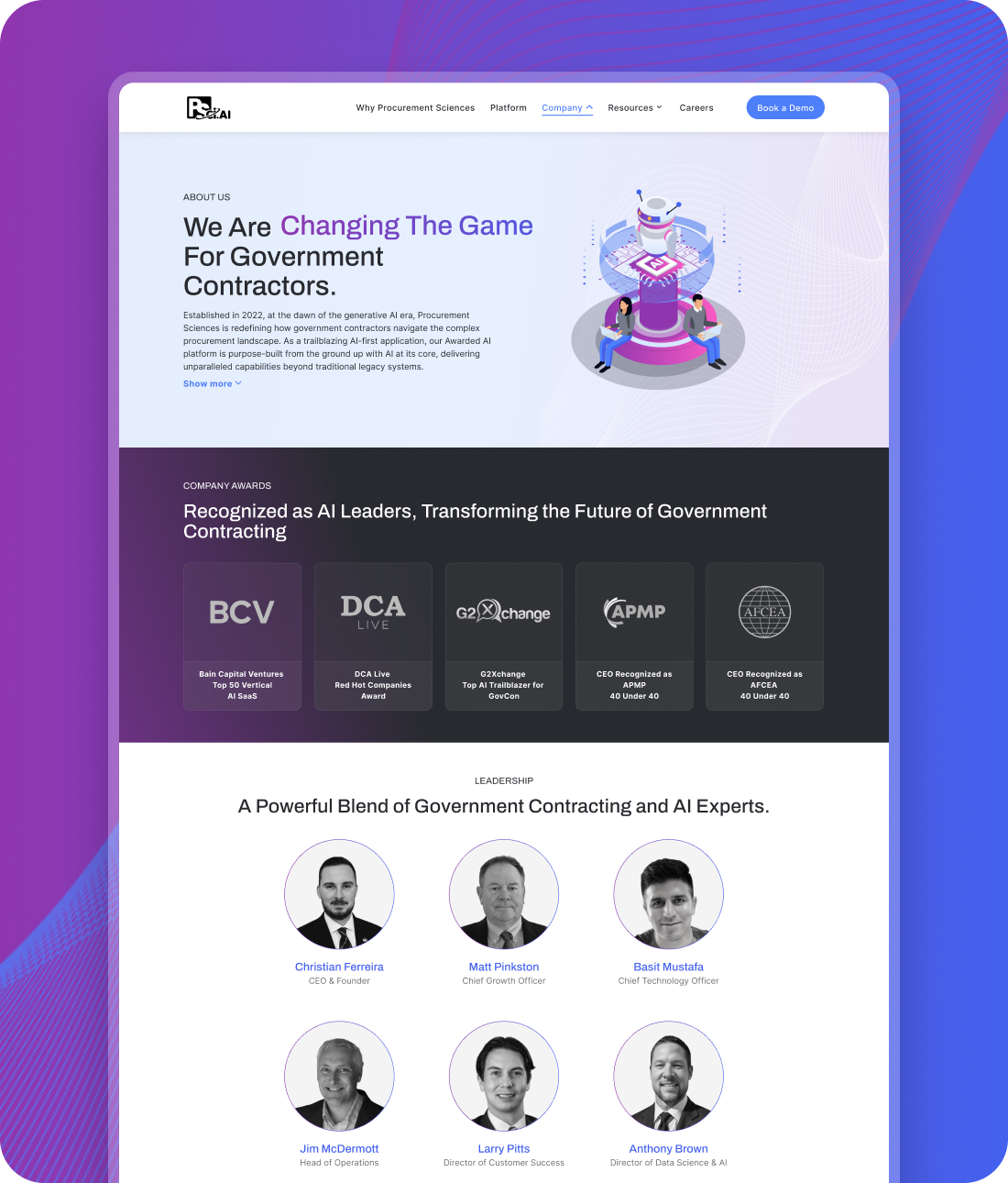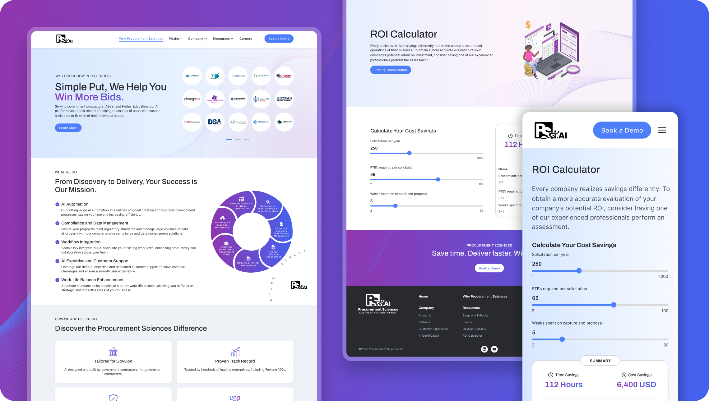 The modern visual design, cohesive branding, and custom illustrations elevated PSci’s digital presence, reinforcing their credibility as a forward-thinking leader in the procurement and AI space. The consistent visual identity across all pages strengthened brand recognition and user trust.