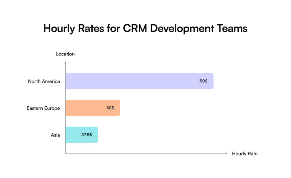 Location Where you hire impacts the cost to build custom CRM by 200–300%. North American rates are highest, typically $100–$200/hour. Eastern Europe offers rates between $40–$80/hour.
