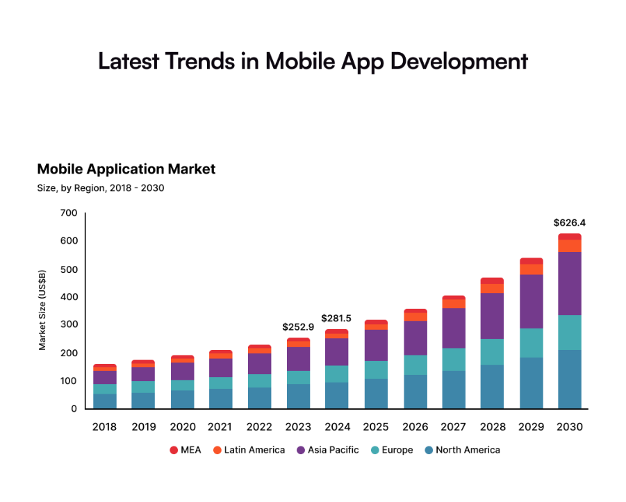 According to Grand View Research, the global mobile app market is set to reach over $626.39 billion by 2030, fueled by AI, edge computing, and multi-platform ecosystems. This makes it important for businesses to stay ahead of the competition by adopting the latest mobile app trends.
