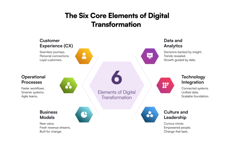 Here’s a closer look at these six elements and how they shape true digital transformation.